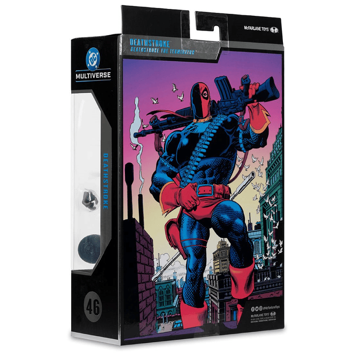 Esta figura de Deathstroke incluye 2 manos intercambiables adicionales y 4 accesorios de armas, además de un stand y una tarjeta coleccionable con una ilustración del personaje en el anverso y una biografía del personaje en el reverso.